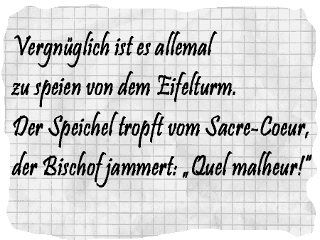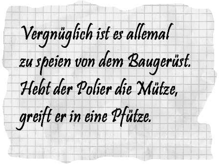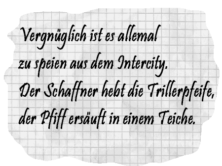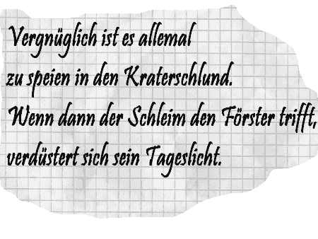 Es ist ja kein Geheimnix, dass mein altes Ego literarisch schon frühzeitig Runen ins Kulturkarussell meißelte, die die Fachwelt vor Neid erbleichen ließen. Kein Wunder, dass Missgunst und falscher Leumund dem Keim der Erblühung pejorativ ins träumend Auge spie, will sagen, alles dransetzte, um den unliebsamen Konkurrenten in den Orkus des Vergessens zu schmähen. Vergebliche Mühe!