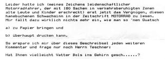 Scheiß drauf, sagt der Klumpsack (s. u.) ungalant, und deshalb kommen wir zu dem Motorradartikel, den ich 37jährig (42? 47? 57?) im Jahr 1990 oder 98 oder 92 verfasste, und der im Magazin MOTORRAD in freier Illegalität kopiert wurde. Mit mildem Zeigefinger hingewiesen hatte ich auf einige mit dem Bikerhobby verbundene Effekte: Lärm, Abgase, rüde Fahrweise, Missachtung der Verkehrsregeln u.a.